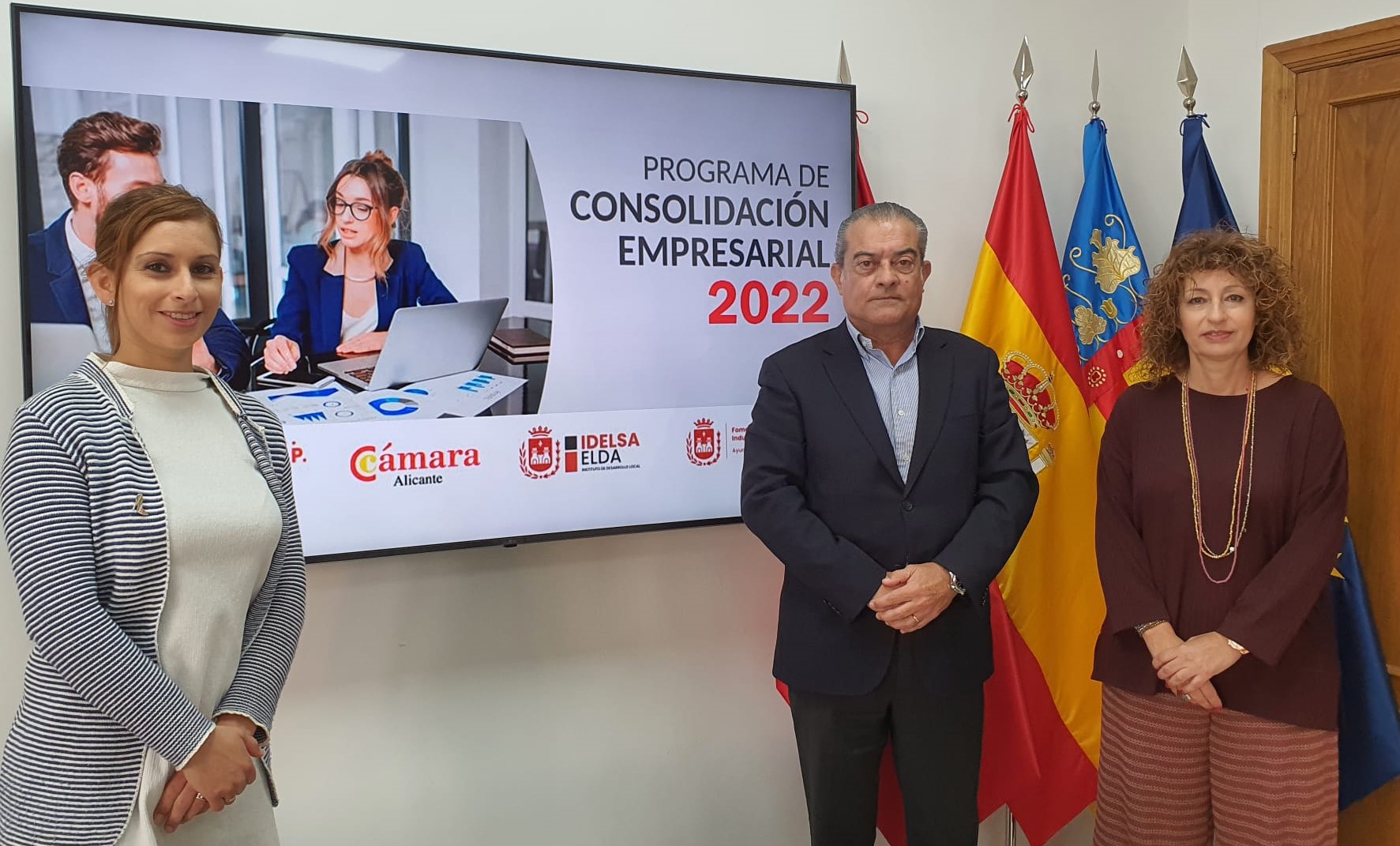 La concejala de Fomento Económico, Industria y Empleo, Silvia Ibáñez, acompañada del secretario general de la Cámara de Comercio de Alicante, Andrés Sevila, y de Esther Montes, responsable del Departamento de Formación de la Cámara, ha presentado esta mañana el Programa de Consolidación Empresarial 2022 organizado por la entidad cameral alicantina. Este programa cuenta con la subvención de la Conselleria de Economía Sostenible, Sectores Productivos, Comercio y Trabajo.