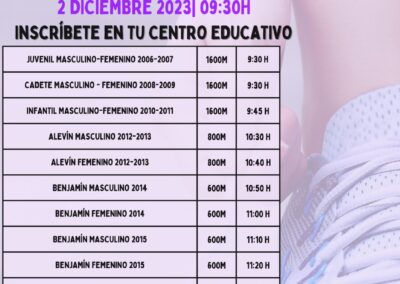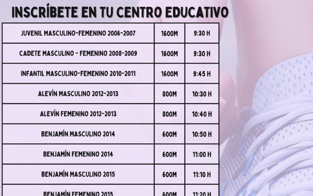 A las 10.00 horas se llevará a cabo la entrega de medallas en estas tres categorías y a partir de las 10.30 horas darán comienzo las pruebas para alevines (800 metros), benjamines (600 metros) y prebenjamines (400 metros). La entrega de medallas se efectuará a las 12.30 horas.
