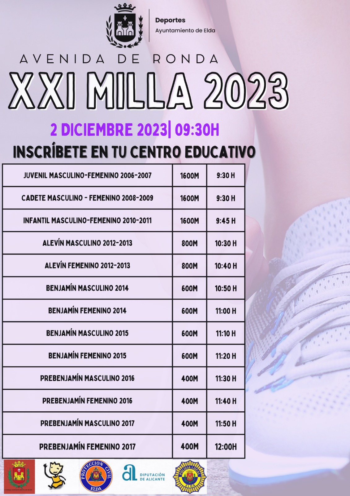 El próximo sábado se celebrará en la Avenida de Ronda la XXI Milla Escolar de Elda, prueba que abre la fase local de los Juegos Deportivos y que fue aplazada hace cuatro semanas por la alerta amarilla por fuertes rachas de viento.
