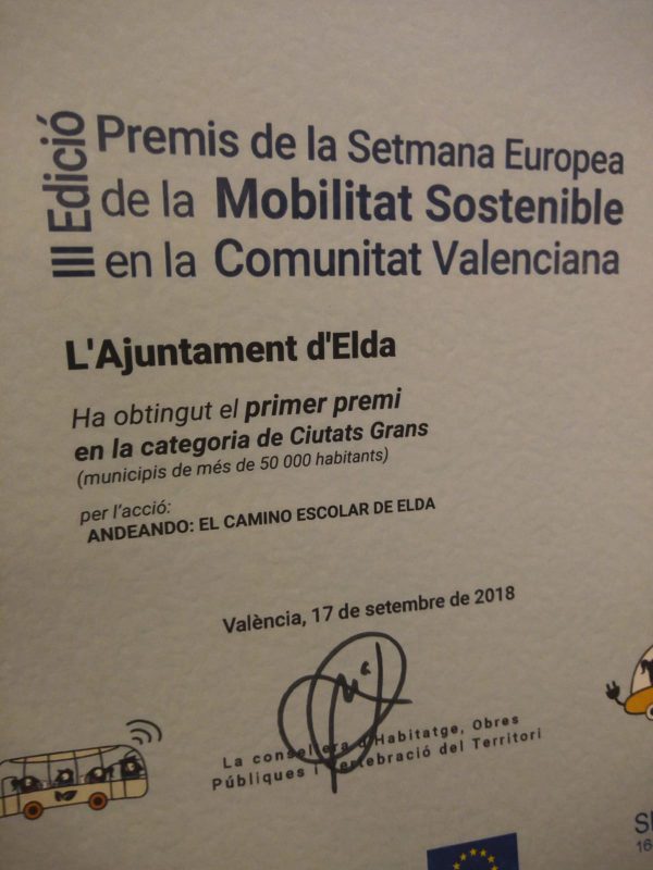 El proyecto “Andeando: El camino escolar de Elda”, impulsado por la concejalía de Medio Ambiente con la colaboración de las concejalías de Seguridad, Educación y Obras, se ha proclamado vencedor de la III edición de los premios de la Semana Europea de la Movilidad 2018 que convoca la consellería d’Habitatge, Obres Publiques i Vertebració del Territori de la Generalitat Valenciana. El proyecto eldense se ha impuesto en la categoría de ciudades grandes, de más de 50.000 habitantes, un premio que el año pasado fue para Valencia, con el anillo ciclista que recorre toda la ciudad.