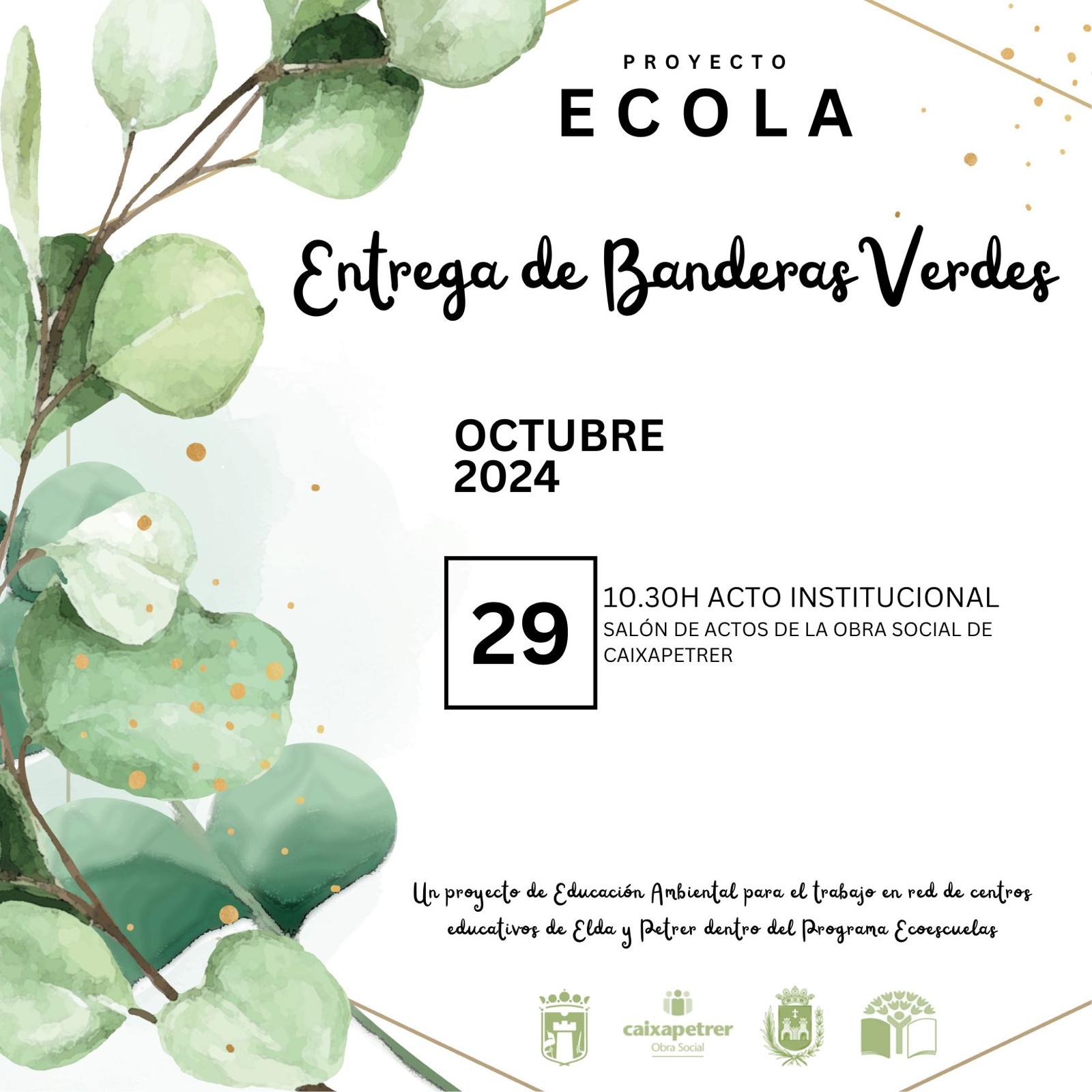 El salón de actos de la Obra Social de Caixa Petrer acogerá el próximo martes, 29 de octubre, a partir de las 10.30 horas, el acto de entrega de Banderas Verdes a los centros educativos de Elda y de Petrer que participan en el Proyecto Écola, surgido de la alianza de los Ayuntamientos de las dos localidades, la Obra Social de Caixapetrer y el Programa de Ecoescuelas de la Asociación de Educación Ambiental y del Consumidor (ADEAC).