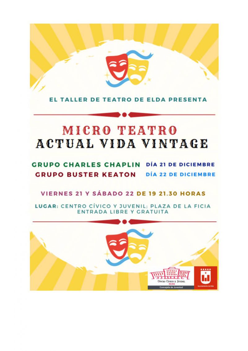 El Taller de teatro Municipal de Juventud ha preparado varios pases de micro teatro que se representarán los días 21 y 22 de diciembre en el Centro Cívico y Juvenil de Elda en horario de 19:00 a 21:30.