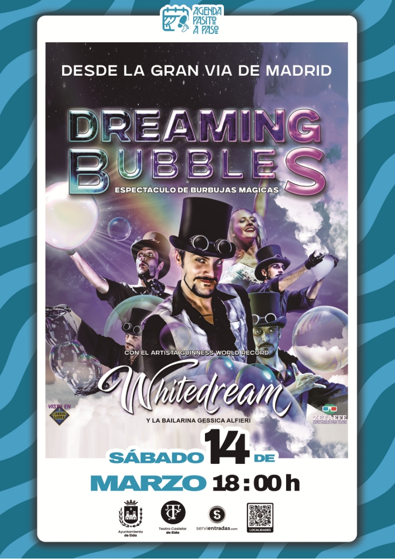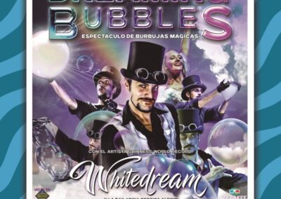 El sábado 14 de marzo, a las 18:00 horas, llega a las tablas del Castelar un espectáculo que, de la mano de Whitedream, el Mago de las Pompas de Jabón y Récord Guinness, sumergirá al público en una experiencia fantástica para soñar en familia, llena de emociones y risas dentro del efímero mundo de las burbujas: ‘Dreaming Bubbles’.