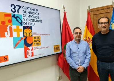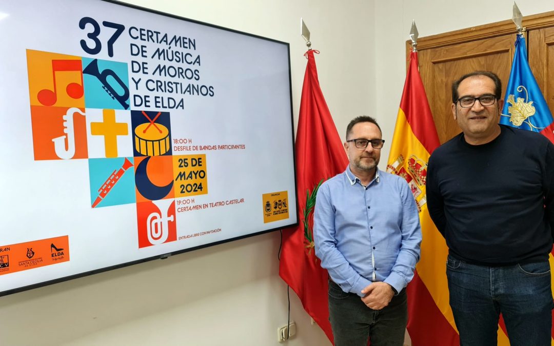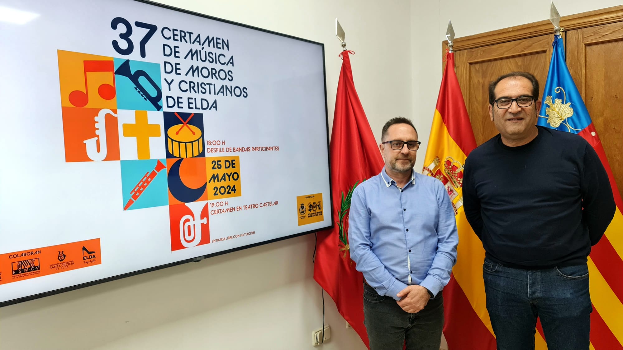 El concejal de Fiestas, David Guardiola, y el presidente de la Junta Central de Comparsas de Moros y Cristianos de Elda, Pedro Serrano, han presentado esta mañana la edición número 37 del Certamen de Música de Moros y Cristianos que se celebrará el 25 de mayo de 2024.