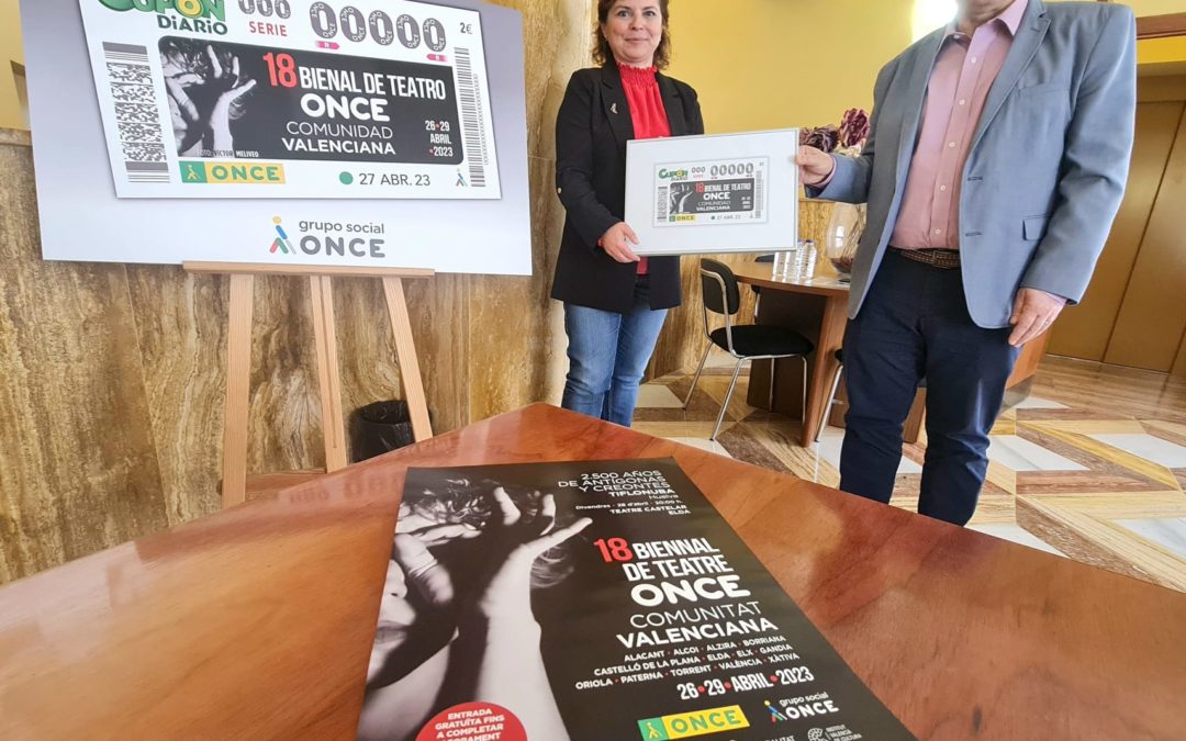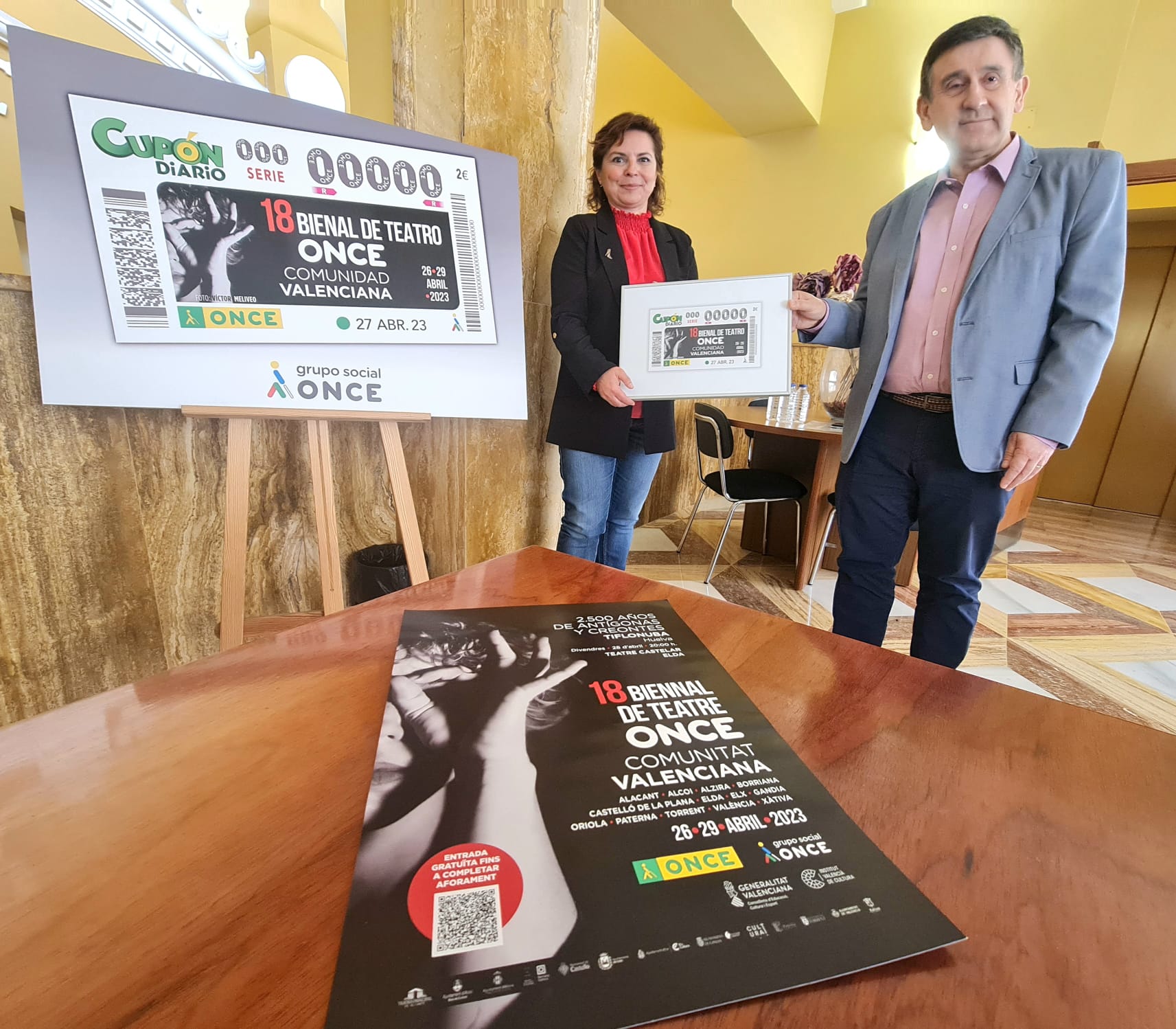 La concejala de Teatro, Rosa Vidal, y el director de la ONCE en Elda, Carlos Carrazoni, han presentado esta mañana el cupón que dedicará la organización el próximo lunes, 27 de abril, a su 18ª Bienal de Teatro que se celebrará en Elda, entre otras ciudades de la Comunidad Valenciana. En el caso de Elda, la celebración se realizará el próximo 28 de abril, a las 20.00 horas, en el Teatro Castelar con la representación de ‘2.500 años de Antígonas y Creontes’ a cargo del grupo teatral Tiflonuba.