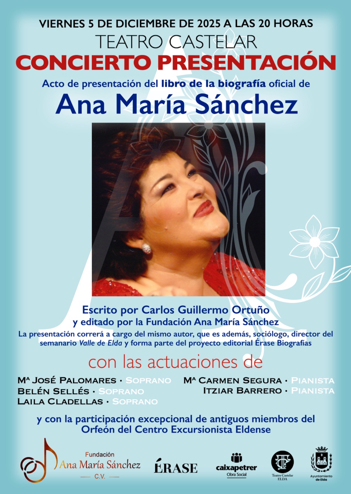 El Teatro Castelar acogerá el viernes, 5 de diciembre, la presentación de la biografía oficial de Ana María Sánchez, una obra escrita por Carlos Ortuño y editada por la Fundación que lleva el nombre de la soprano eldense, en colaboración con el Ayuntamiento de Elda. El acto, que dará comienzo a las 20.00 horas, incluye un concierto en el que se interpretarán diez piezas musicales que servirán como hilo conductor de la presentación.