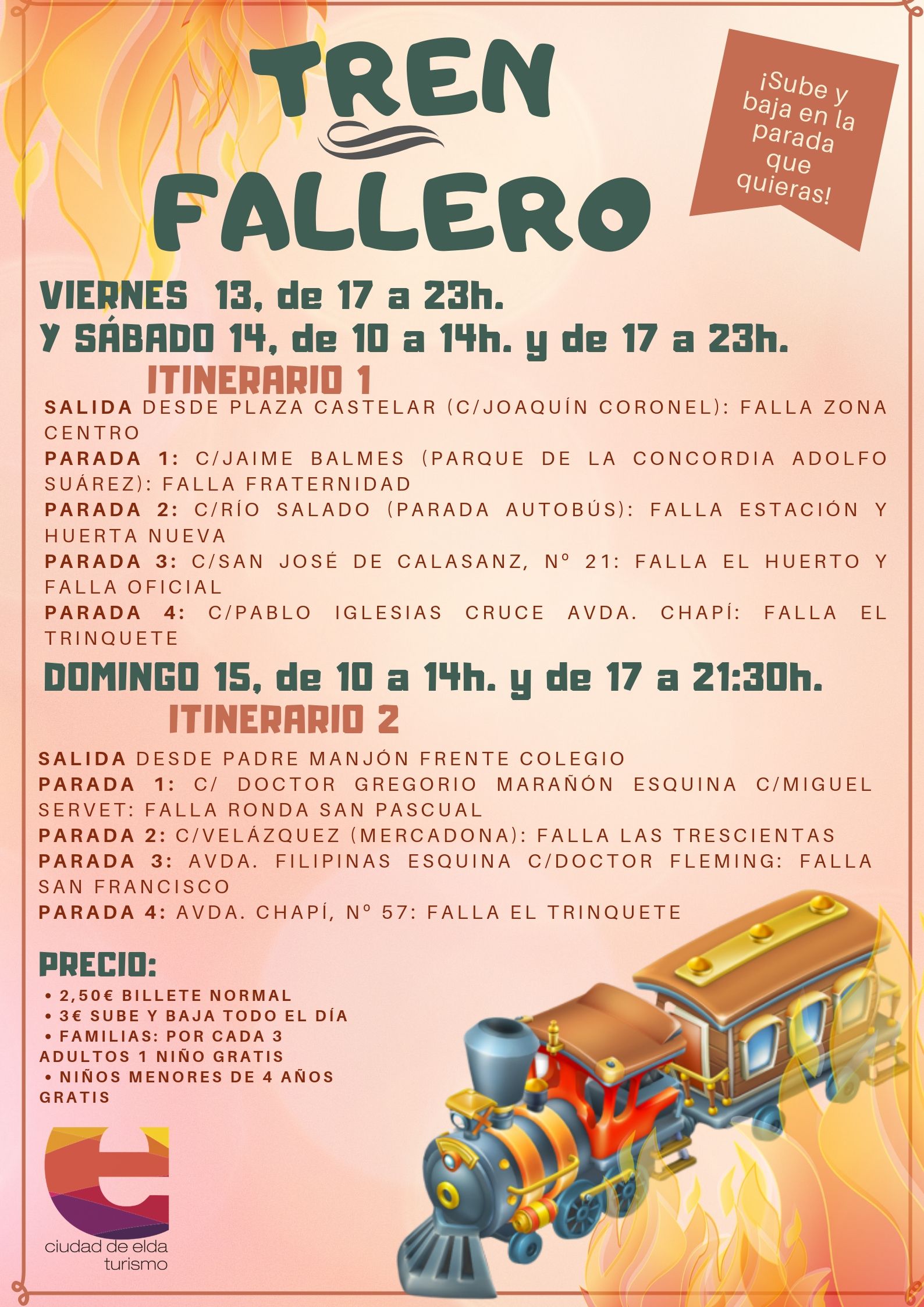 Por su parte, el ‘Tren Fallero’ tendrá dos itinerarios diferentes: el viernes (de 17.00 a 23.00 horas) y el sábado (de 10.00 a 14.00 y de 17.00 a 23.00 horas) tendrá el punto de partida en la calle Joaquín Coronel, a la altura de la Plaza Castelar, con paradas en Jaime Balmes, Río Salado, San José de Calasanz y Pablo Iglesias (esquina Avenida de Chapí). El domingo (de 10.00 a 14.00 y de 17.00 a 21.30 horas) el tren partirá desde Padre Manjón y tendrá paradas en Doctor Marañón (esquina Miguel Servet), Velázquez (a la altura de Mercadona), Avenida Filipinas (esquina Doctor Fleming) y Avenida de Chapí).