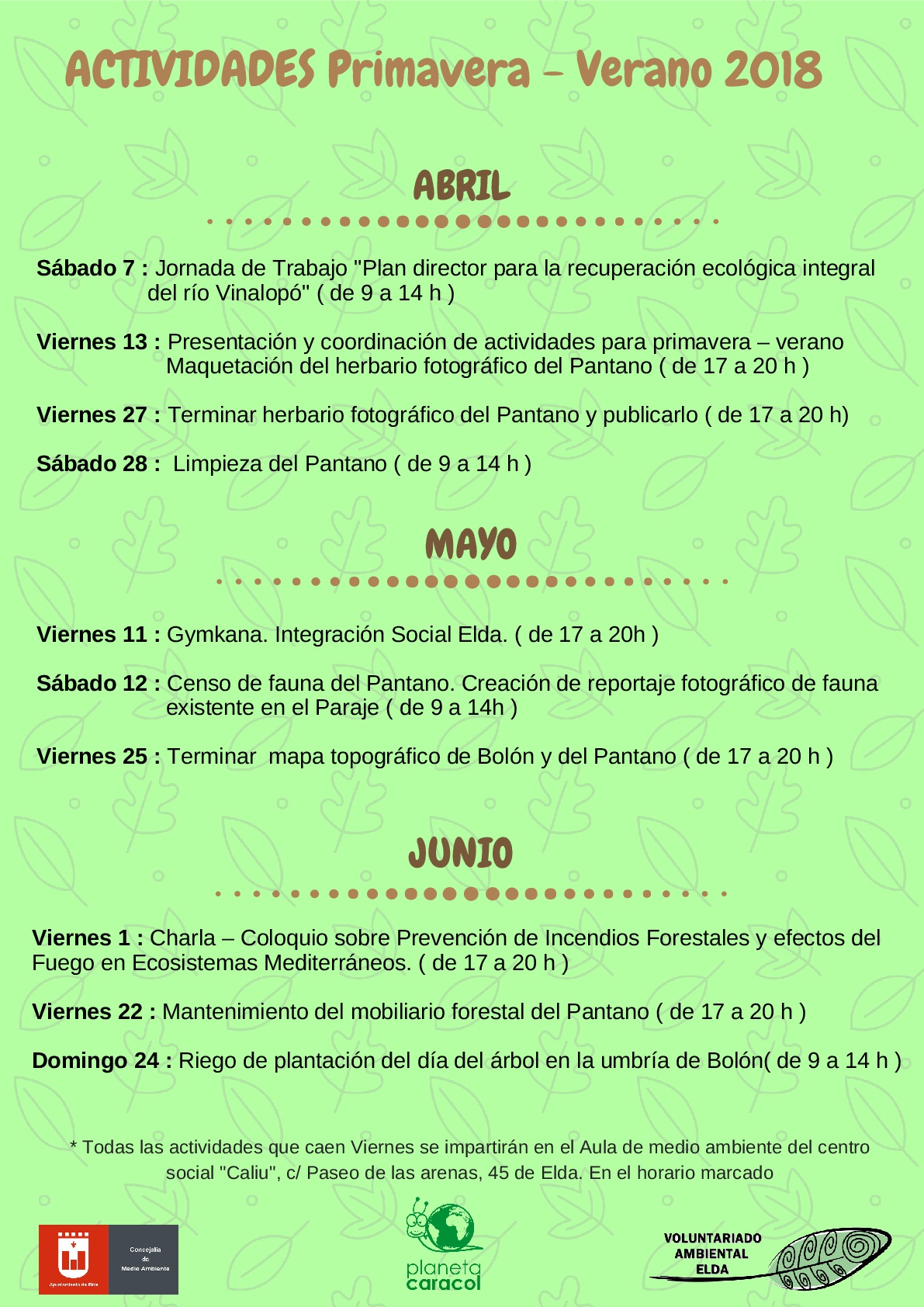 La nueva programación para los meses primaverales incluye yincanas, excursiones, ubicaciones topográficas, reportajes fotográficos o jornadas formativas. Las actividades son gratuitas y para participar en ellas sólo es necesario formar parte del grupo de voluntariado, que se puede hacer rellenando la hoja de inscripción y depositarla en la concejalía de Medio Ambiente del Ayuntamiento de Elda, o enviarla a través de la aplicación de mensajería WhatsApp en el teléfono 640.218.064.