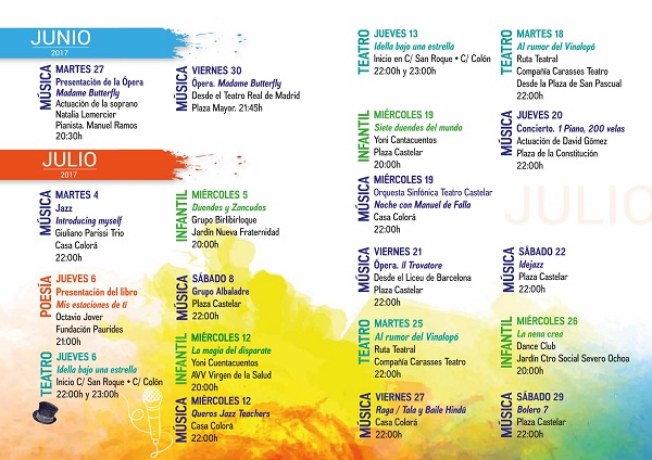 También entre la programación encontramos actuaciones específicas para los más pequeños, que tendrán lugar los miércoles a las 8 de la tarde. El día 5 se representará el espectáculo Duendes y Zancudos en los jardines de Nueva Fraternidad, el 12 se presentará el cuentacuentos La magia del disparate en la Asociación de Vecinos Virgen de la Salud, el 19 en la Plaza Castelar el cantacuentos Siete duendes del mundo y por último, el día 26 se presentará la verbena infantil La nena crea en el jardín anexo al Centro Social Severo Ochoa.