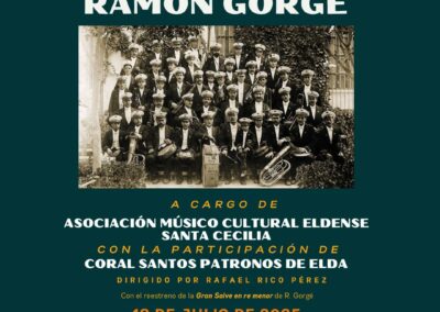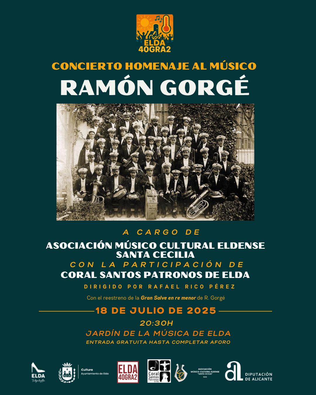 El próximo 18 de julio el ciclo cultural Elda 40Gra2 ofrecerá un emotivo concierto homenaje al músico Ramón Gorgé Soler, una figura fundamental del panorama musical local. El acto, organizado por la Asociación Músico Cultural Eldense Santa Cecilia con la participación de la Coral Santos Patronos de Elda, junto a la Concejalía de Cultura del Ayuntamiento de Elda, se celebrará en el Jardín de la Música a las 20:30 horas, con entrada gratuita hasta completar aforo.