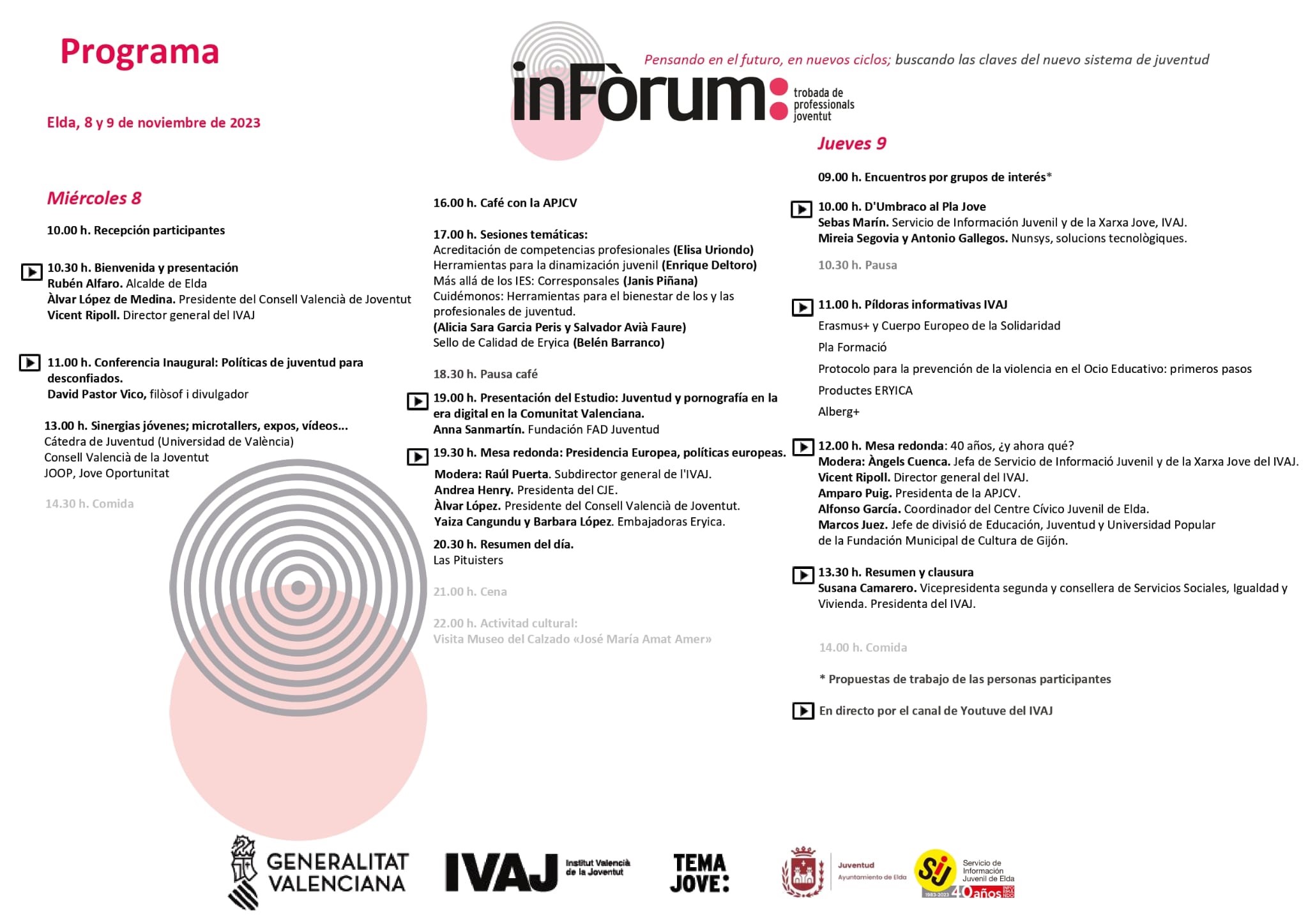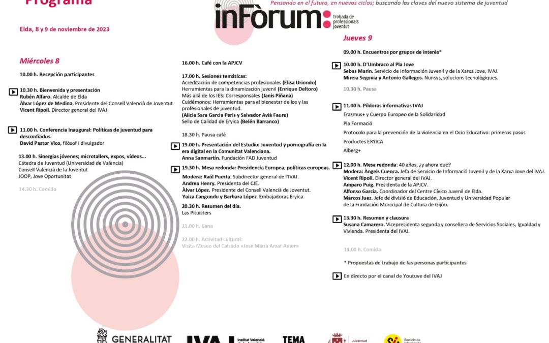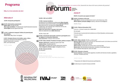 La edición de 2023 del encuentro Infòrum lleva por lema ‘Pensando en el futuro, en nuevos ciclos; buscando las claves del nuevo sistema de juventud’. El director general del IVAJ, Vicente Ripoll, ha afirmado que se trata de la “cita anual más importante de profesionales de juventud para actualizarse y encontrar soluciones a los problemas diarios en sus puestos de trabajo”.