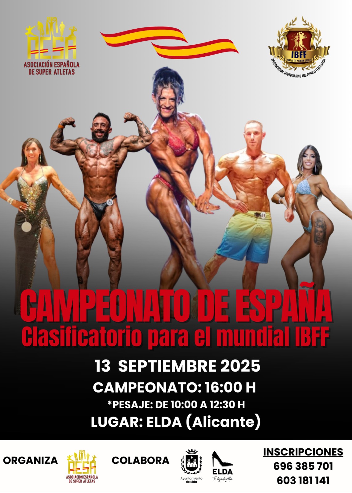 Elda acogerá el 13 de septiembre el Campeonato de España de Fisicoculturismo, competición organizada por la Asociación Española de Super Atletas en colaboración con el Ayuntamiento de Elda. Las pruebas darán comienzo con el pesaje de los participantes, que se realizará de 10:00 a 12:30 horas, y continuará con la competición a partir de las 16:00 horas.