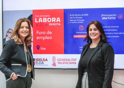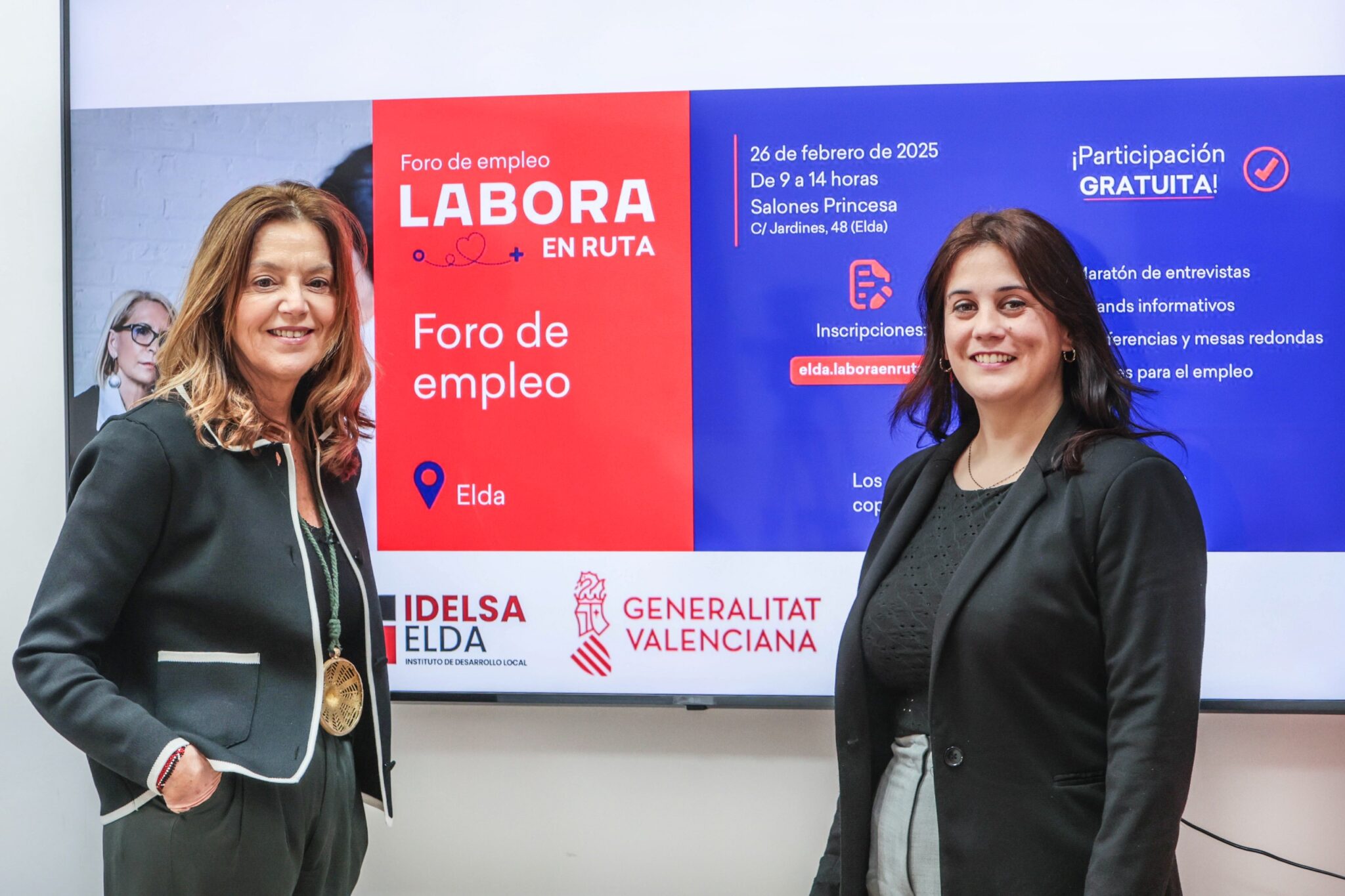 a concejala de Fomento Económico, Industria y Empleo, Lorena Pedrero, junto con la directora territorial de Labora en la provincia de Alicante, Cortés Martínez, ha anunciado esta mañana la celebración en Elda del Foro de Empleo ‘Labora en Ruta’, que tendrá lugar el miércoles 26 de febrero, de 9:00 a 14:00 horas, en las instalaciones de los Salones Princesa.