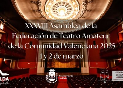 Elda se convertirá el próximo fin de semana en la capital del teatro amateur de la Comunidad Valenciana con motivo de la celebración de la 38ª edición de la Asamblea de la Federación de Teatro Amateur de la Comunidad Valenciana (FTACV). Los días 1 y 2 de marzo más de 225 actores y actrices pertenecientes a 39 grupos de teatro amateur valenciano se darán cita en la ciudad para celebrar, además, la gala de entrega de Premios Tablas que la FTACV concede cada año.