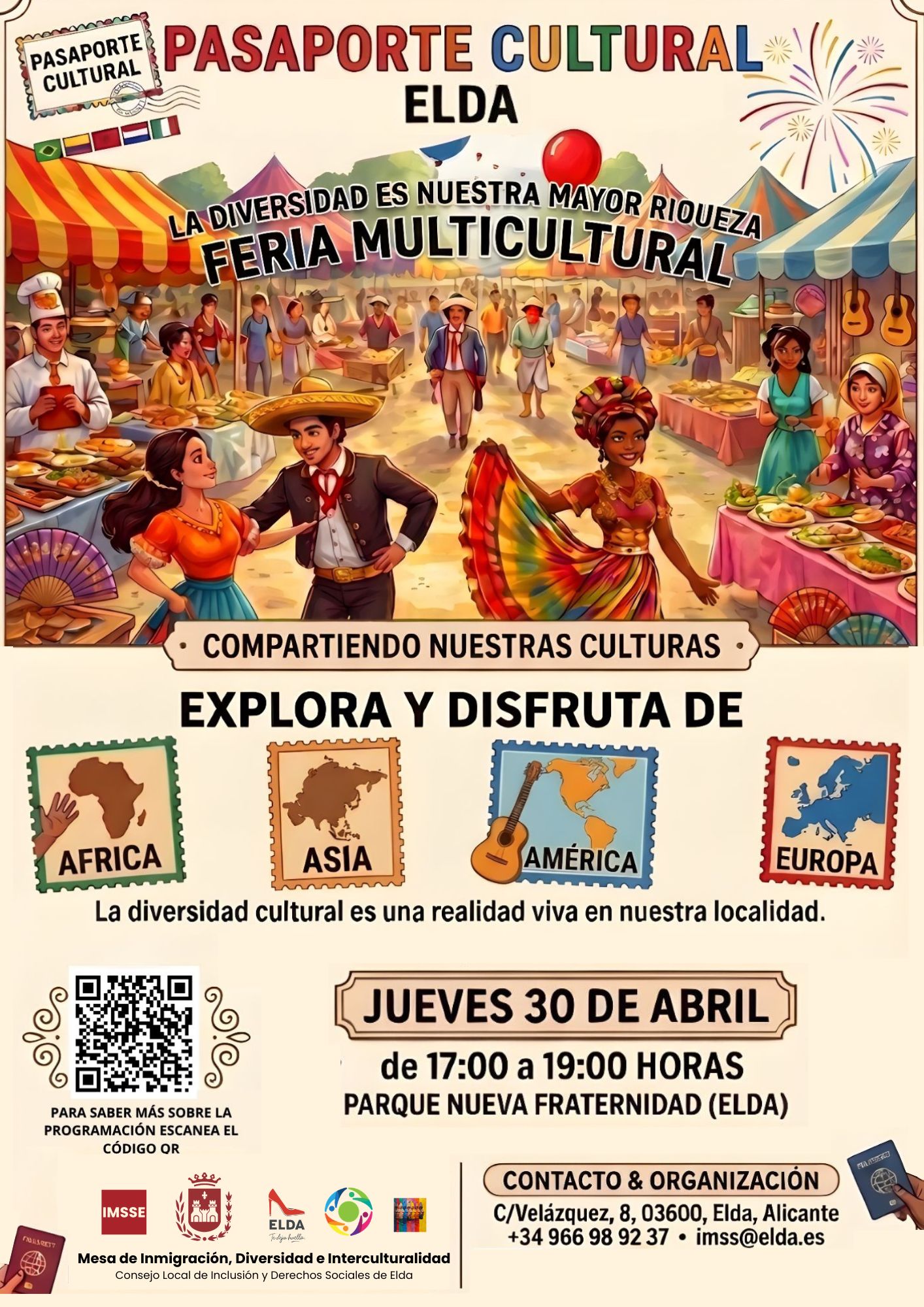 Esta iniciativa propone un espacio educativo, lúdico y participativo donde las personas podrán acercarse a distintas culturas a través de experiencias directas, visibilizando la riqueza cultural existente en la ciudad de Elda. El edil ha destacado que se realizarán actividades para todos los públicos y se podrá disfrutar de una diversa programación de actividades interculturales, entre las que destacan stands culturales con representación de diferentes países y tradiciones, zona gastronómica con degustación de platos típicos del mundo, actuaciones musicales y danzas internacionales, talleres interculturales, como henna, caligrafía china, máscaras africanas o elaboración de pulseras, juegos tradicionales del mundo y actividades participativas como el pasaporte cultural, que permitirá recorrer los distintos espacios de la feria.
