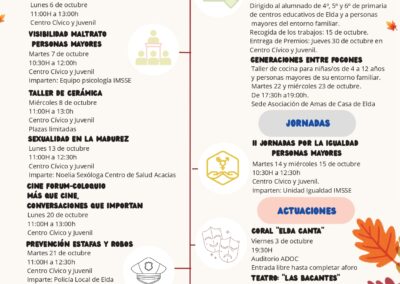 Las dos actividades intergeneracionales consistirán en el II Concurso de Narrativa Ilustrada ‘Vínculos que enriquecen’, dirigido al alumnado de 4º, 5º y 6º de Primaria de los centros educativos eldenses y a personas mayores del entorno familiar. La recogida de trabajos será el 15 de octubre y la entrega de premios el 30 del mismo mes en el Centro Cívico. La segunda actividad será el taller de cocina ‘Generaciones entre fogones’, para niños y niñas de 4 a 12 años y personas mayores de su entorno familiar. Se celebrará los días 22 y 23 de cotubre en la sede de la Asociación de Amas de Casa de Elda.