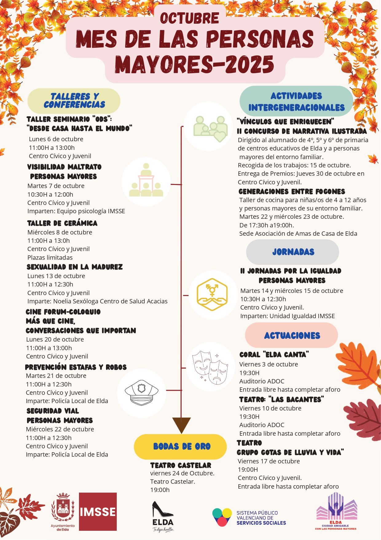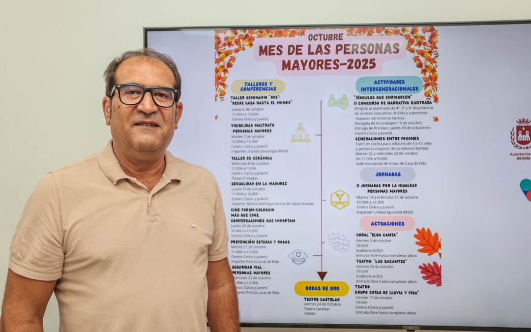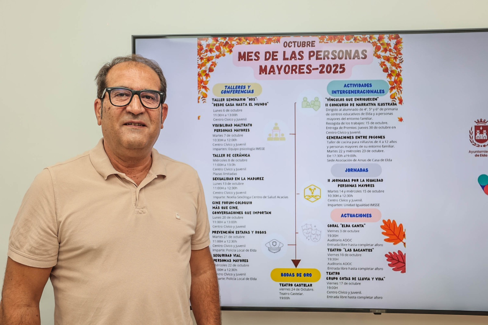 Elda celebrará en octubre, un años más, el Mes del Mayor con un calendario de propuestas y actividades de carácter gratuito y organizadas por el Ayuntamiento. Así lo ha anunciado esta mañana el concejal de Personas Mayores y Bienestar Social, David Guardiola, quien ha recordado que «desde el gobierno local tenemos muy presentes a las personas mayores y, por ese motivo, hemos preparado de nuevo un mes lleno de actividades, conferencias, talleres y actuaciones».