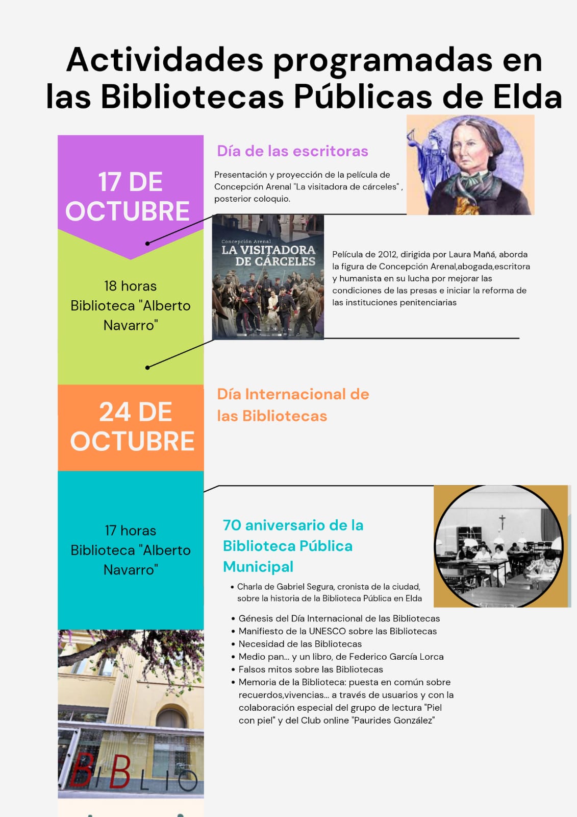 El Ayuntamiento de Elda, a través de la Concejalía de Cultura, celebra el Día Mundial de las Escritoras y el Día Mundial de las Bibliotecas con sendas actividades que tendrán lugar los días 17 y 24 de octubre.