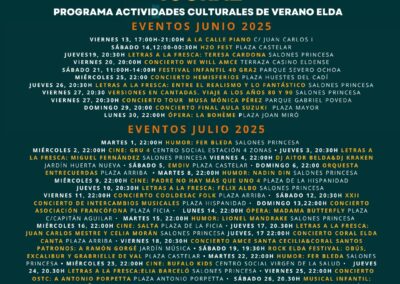“Este año hemos diseñado una programación diversa, con propuestas de calidad que abarcan música, historia, teatro, ópera, cine, humor y literatura, pensadas para todos los públicos y gustos”, ha señalado el concejal de Cultura, Iñaki Pérez Rico. “Queremos que la cultura llegue a todos los rincones de Elda, por eso hemos repartido las actividades por todos los barrios de la ciudad, utilizando plazas, parques y espacios emblemáticos para que ningún vecino se quede sin la oportunidad de disfrutar del verano cultural”.
