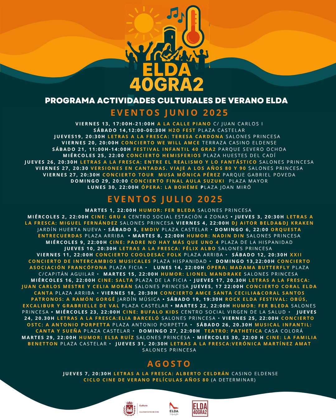 El Ayuntamiento de Elda, a través de la Concejalía de Cultura y en colaboración con diferentes áreas municipales, ha anunciado hoy la programación de ‘Elda 40Gra2’, que ofrecerá un verano lleno de música, teatro, cine y literatura con una variada agenda de actividades culturales gratuitas desde el 13 de junio hasta finales de agosto de 2025.