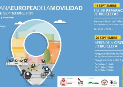 El Ayuntamiento de Elda, a través de la Concejalía de Control de la Movilidad y con motivo de la Semana Europea de la Movilidad que se celebra del 16 al 22 de septiembre, ha organizado un taller de reparación de bicicletas y una gincana para aprender a circular sobre dos ruedas. Las actividades tendrán lugar en el Parque Infantil de Tráfico situado en la Avenida Las Agualejas el viernes 19 de septiembre por la tarde y el sábado 20 de septiembre por la mañana.