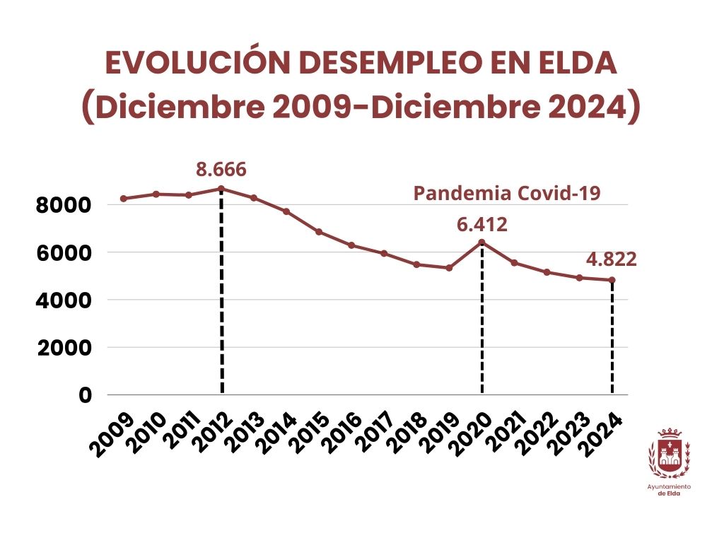 Elda cerró el ejercicio 2024 con las mejores cifras de empleo desde 2009, primer año en el que hay registros facilitados por el Servicio de Empleo Público Estatal (SEPE). Después de bajar el número de parados en 21 personas en el mes de diciembre, el mercado laboral eldense concluyó 2024 con 4.822 parados, el dato más bajo desde que hay registros oficiales y segundo año consecutivo en el que se cierra el ejercicio por debajo de la barrera de las 5.000 personas sin empleo.