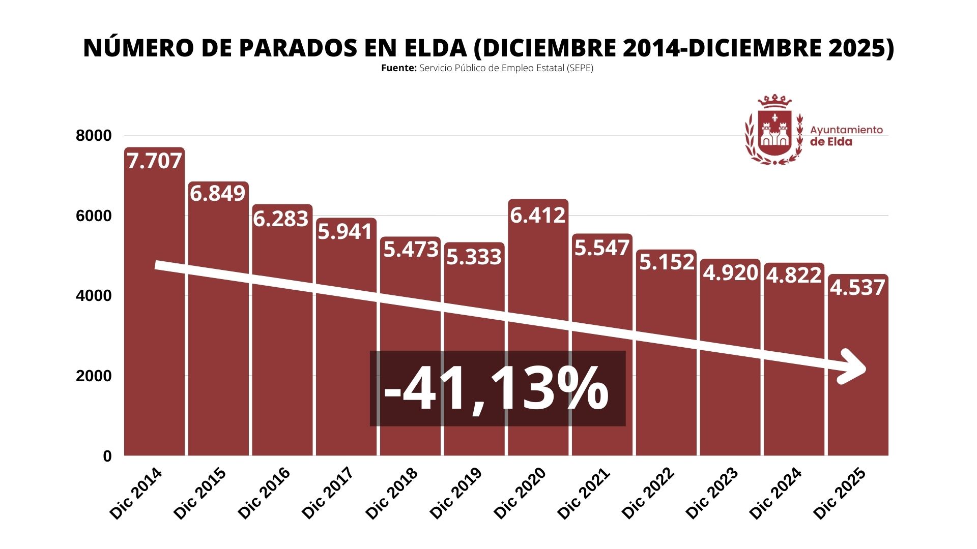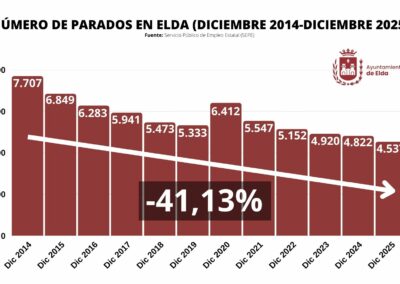 Elda ha finalizado el año 2025 con los mejores índices de empleo registrados desde 2009, año en el que comenzaron a recogerse los datos oficiales del Servicio Público de Empleo Estatal (SEPE). Tras una disminución de 85 personas en desempleo durante el mes de diciembre, la cifra total de parados se situó en 4.537, el nivel más bajo en la historia reciente y marcando el tercer año consecutivo en el que la ciudad cierra el ejercicio con menos de 5.000 desempleados.