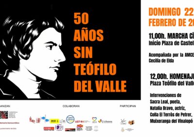 El acto finalizará con las intervenciones de la poeta Sacra Leal, que leerá un poema original dedicado a Teófilo del Valle, acompañada a la guitarra por Pepe Payá, y la actuación de la actriz Natalia Bravo. Tras estas intervenciones tendrá lugar la entrega de 50 flores en el pequeño monolito que recuerda a Teófilo. Finalizará el acto con la actuación de la Colla de Dolçainers i Tabalers El Terròs de Petrer y la Muixeranga del Vinalopó.
