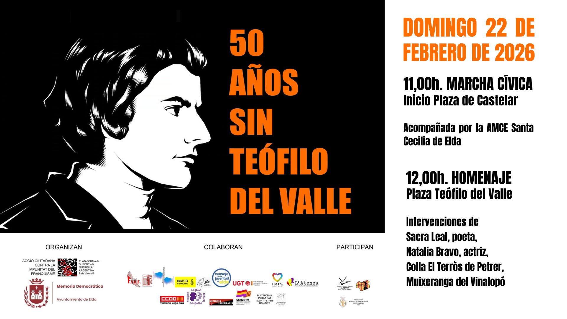 Elda conmemorará el próximo 22 de febrero el 50 aniversario de la muerte de Teófilo del Valle, joven eldense de 20 años que murió por disparos de la Policía Armada durante una movilización obrera del sector del calzado. Los actos comenzarán a las 11:00 horas con una marcha cívica que partirá desde la Plaza Castelar y finalizará con un acto de homenaje en la plaza que lleva su nombre.