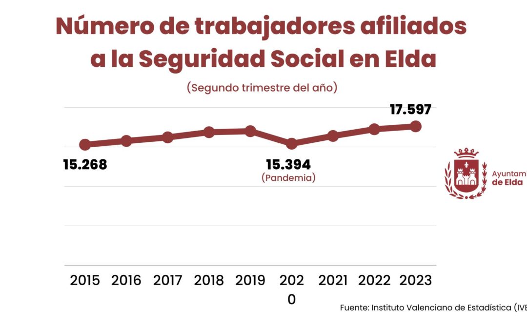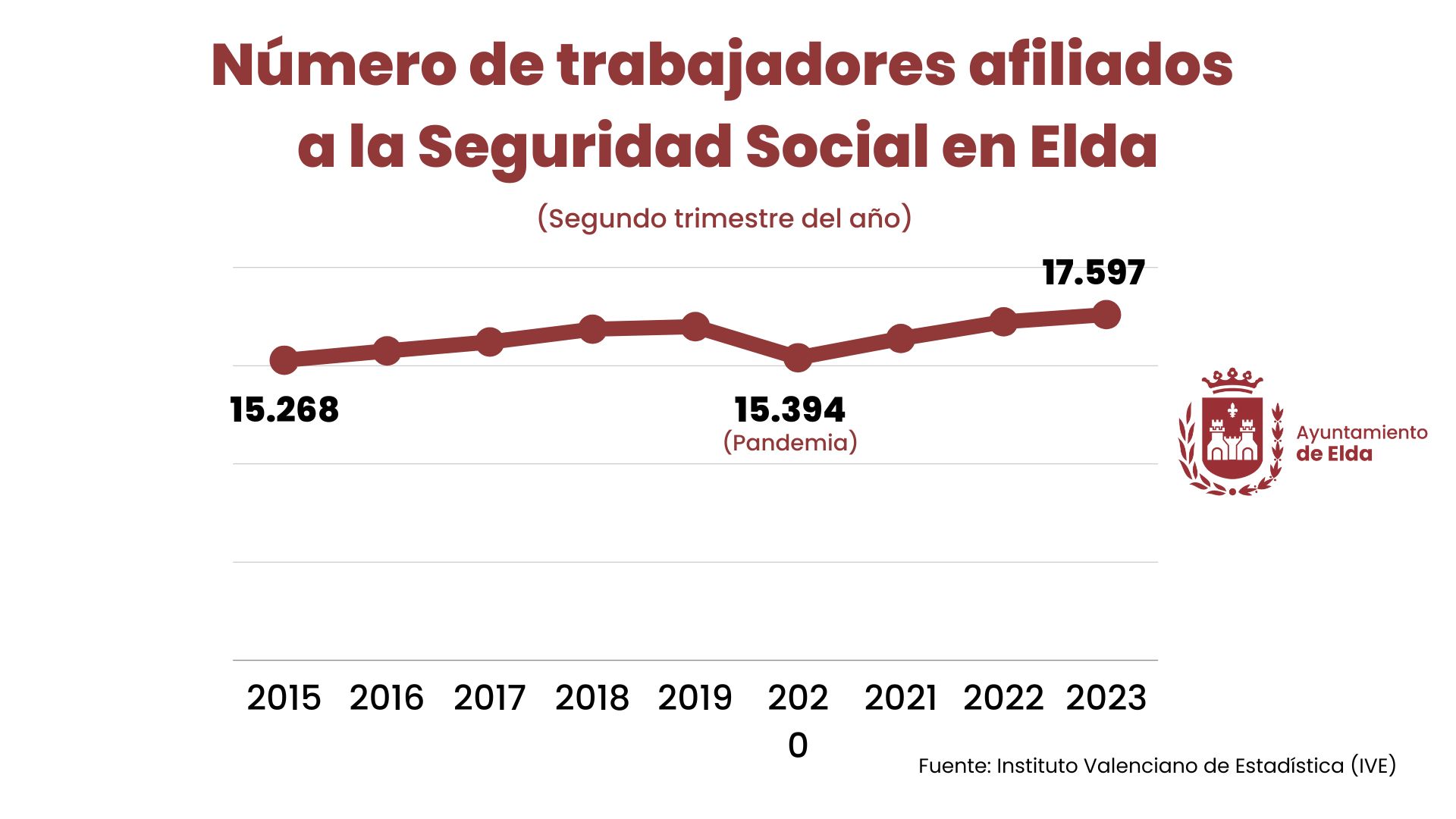 El número de trabajadores eldenses afiliados a la Seguridad Social sigue creciendo y durante el segundo trimestre de 2023 se sitúa en las 17.595 personas inscritas, la cifra más alta del último decenio