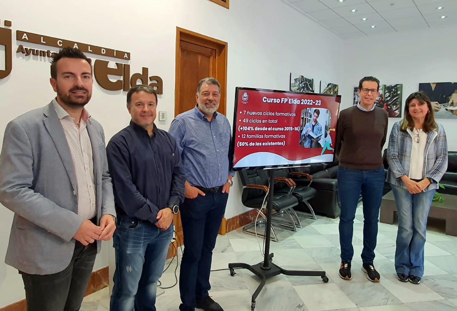 El alcalde de Elda, Rubén Alfaro, ha anunciado hoy que la Conselleria de Educación ha concedido a los centros educativos eldenses siete ciclos de FP nuevos, con lo que ya son 49 los ciclos formativos impartidos por el CIPFP Valle de Elda, IES La Torreta, IES Monastil e IES La Melva. Alfaro ha estado acompañado por el concejal de Educación, Fernando Gómez, y por los directores del CIPFP Valle de Elda, Cristóbal Melgarejo, y del IES La Torreta, Daniel López.
