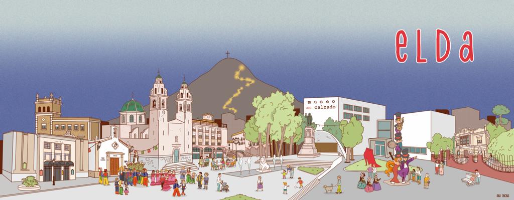 La reconocida autora de cómics ha creado un ‘skyline’ eldense que recoge los edificios y lugares más emblemáticos, como Santa Ana, el Museo del Calzado, el Casino o la Plaza Castelar, además de las fiestas de Moros y Cristianos, las Fallas y la Bajada de Antorchas