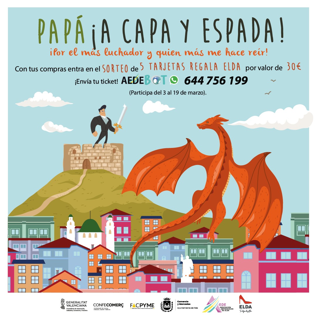 La Asociación de Comerciantes de Elda (AEDE), en colaboración con el Ayuntamiento de Elda y diversas entidades de comercio, ha puesto en marcha la campaña ‘Papá a capa y espada’, una iniciativa que tiene como objetivo fomentar las compras en el comercio local con motivo del Día del Padre.