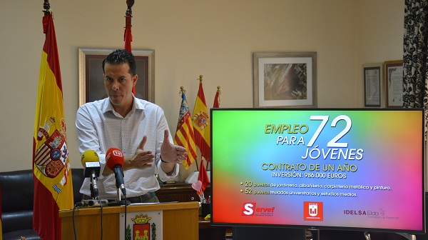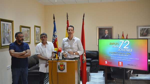 El alcalde, Rubén Alfaro, junto a los concejales de Recursos Humanos, José A. Amat, y de Empleo, Vicente Deltell, ha dado a conocer hoy la resolución del Servicio Valenciano de Empleo y Formación (Servef) del programa Avalem Joves al que el Ayuntamiento de Elda y el instituto municipal Idelda se presentaron solicitando sendas subvenciones para contratar a un total de 72 desempleados durante un año.