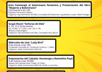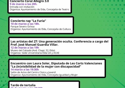 Otras propuestas impulsadas desde la Sede Universitaria son la exposición ‘Científicas: mujeres con ciencia’, con obras de los alumnos y alumnas del taller de pintura de ACAE que tendrá lugar el 7 de marzo en el Museo del Calzado; la conferencia a cargo de Lorena Segura Amat titulada ‘¿Son las matemáticas cosa de hombres?’, que se celebrará en el Museo del Calzado el 7 de marzo a las 20.00 horas. Por último, el 12 de marzo tendrá lugar también en el Museo del Calzado, a las 19.00 horas, la conferencia ‘Las artistas del 27: una generación oculta’, a cargo de José Manuel Guardia.