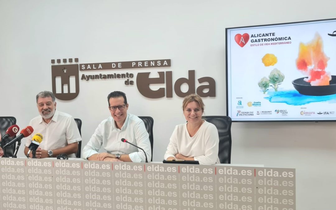 Elda participará en la próxima edición de Alicante Gastronómica, que se celebrará del 23 al 26 de septiembre en IFA y que es uno de los certámenes gastronómicos más importantes de España. Así lo ha anunciado esta mañana el alcalde de Elda, Rubén Alfaro, en una comparecencia en la que ha estado acompañado por la concejala de Turismo, Rosa Vidal, el director del CIPFP Valle de Elda, Cristóbal Melgarejo; y el técnico municipal de Turismo, Samuel Martínez.