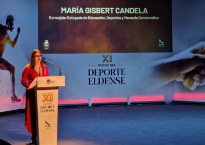 La edil ha afirmado en su intervención que “el objetivo de esta gala es poner en valor no solo los logros y metas conseguidas de este 2023, sino también el esfuerzo y constancia de los deportistas, las familias, los clubes y toda persona que trabaja por el deporte eldense. La noche de hoy es un homenaje a todas las conexiones que el deporte nos da y crea a nuestro alrededor. Es la continuidad de la lucha, de la competición por llegar a ser mejores cada día, por dar lo mejor y por la superación de todas las barreras para llegar a lo más alto, y compartir, compartir los triunfos y dejar un legado imborrable en la historia de nuestra ciudad”.