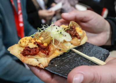 ‘Elda en un bocado’ es una tapa que concentra la identidad y los sabores tradicionales de Elda en un solo bocado. Parte de una base de la torta de migas, crujiente y aromática, que sirve de soporte. Sobre ella se dispone una praliné de fandango (plato típico de Elda), que aporta profundidad, textura cremosa y un guiño a los sabores locales reinterpretados. Encima, un moje de tomate, cebolla, ñora y bacalao del propio fandango. El toque final lo ponen unas uvas en escabeche, que equilibran el conjunto con acidez y dulzor y unas migas de ñora, que refuerzan el aroma, el color y la identidad del plato. El punto crujiente lo aporta unas almendras fritas. Esta y otras tapas se podrán disfrutar en las Terceras Jornadas Gastronómicas Sabor a Elda del 5 al 15 de marzo de 2026.