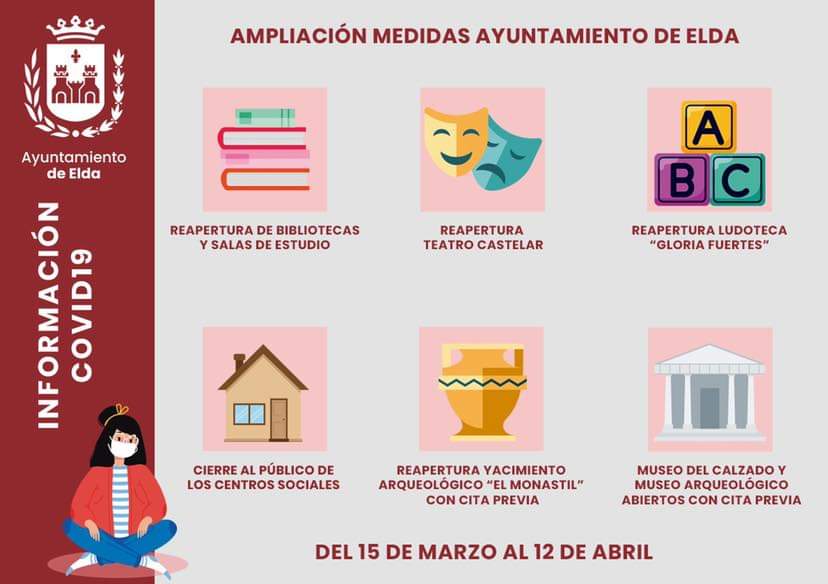 El Ayuntamiento de Elda, a través de un Bando de Alcaldía firmado hoy y con efectos desde el día 15 de marzo de 2021 hasta el 12 de abril de 2021, ambos inclusive, reinicia a partir de mañana el servicio de salas de estudio y lectura en las Bibliotecas Municipales y en el Centro Cívico y Juvenil, de lunes a viernes, en el siguiente horario, siguiendo el protocolo establecido en cada una de ellas y las medidas sanitarias vigentes en cada momento.
