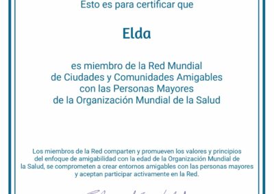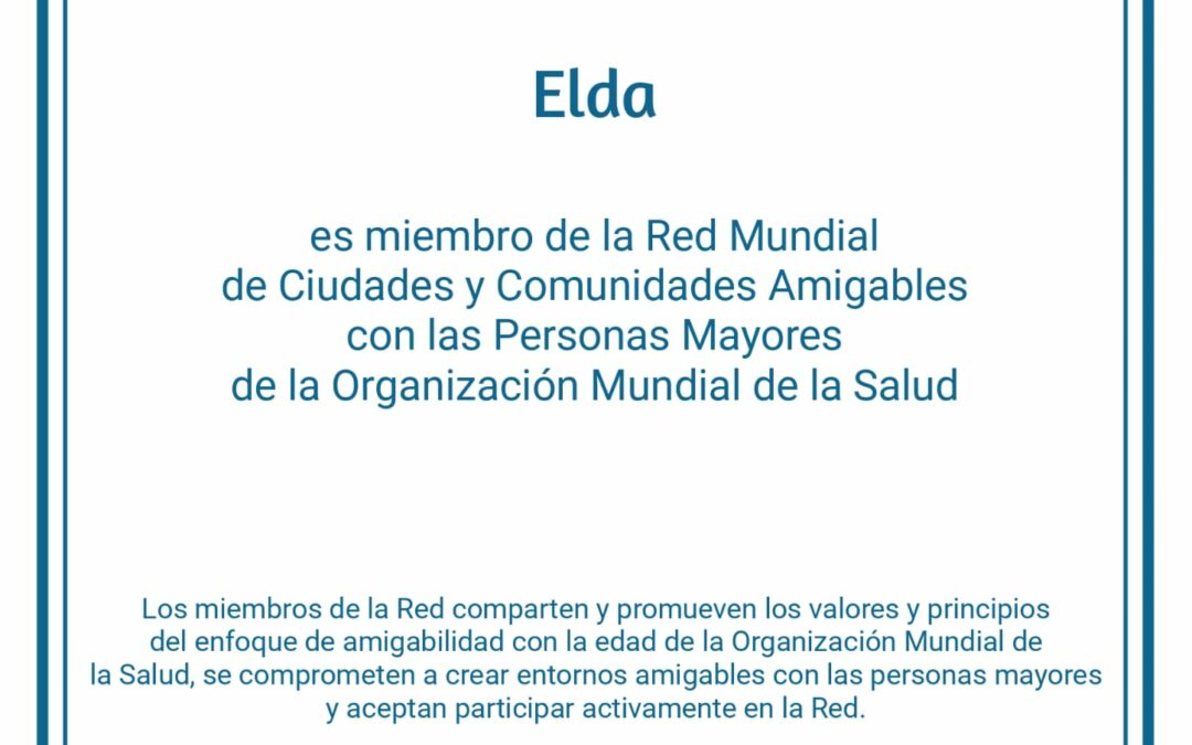 El Ayuntamiento de Elda ha recibido el certificado de la Organización Mundial de la Salud (OMS) que acredita su pertenencia a la Red Mundial de Ciudades y Comunidades Amigables con las Personas Mayores. El certificado, firmado por Thiago Hérick de Sá, responsable técnico del Departamento de Determinantes Sociales de la Salud de la OMS, indica que «los miembros de la Red comparten y promueven los valores y principios del enfoque de amigabilidad con la edad de la OMS se comprometen a crear entornos amigables con las personas mayores y aceptan participar activamente en la Red».