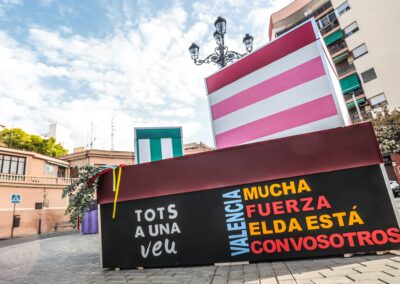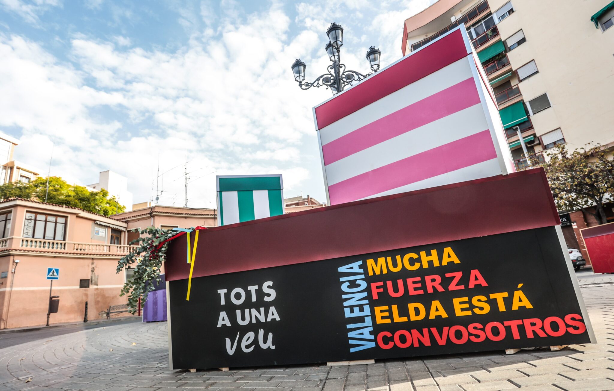 En concreto, los objetos decorativos instalados en las glorietas situadas frente al Parque de Bomberos y en la Plaza de la Farola incluyen el mensaje ‘Tots a una veu. Valencia, mucha fuerza. Elda está con vosotros». Las letras están pintadas con los colores de la Señera.
