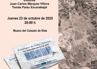 El próximo jueves 23 de octubre, a las 20.00 horas, el salón de actos del Museo del Calzado acogerá la presentación del libro ‘Estampas de Elda y Petrer. Las fotografías aéreas de 1935’. La obra, promovida por la Asociación Mosaico y los Ayuntamientos de Elda y de Petrer, ha sido editada y coordinada por Tomás Palau Escarabajal y Juan Carlos Márquez Villora.