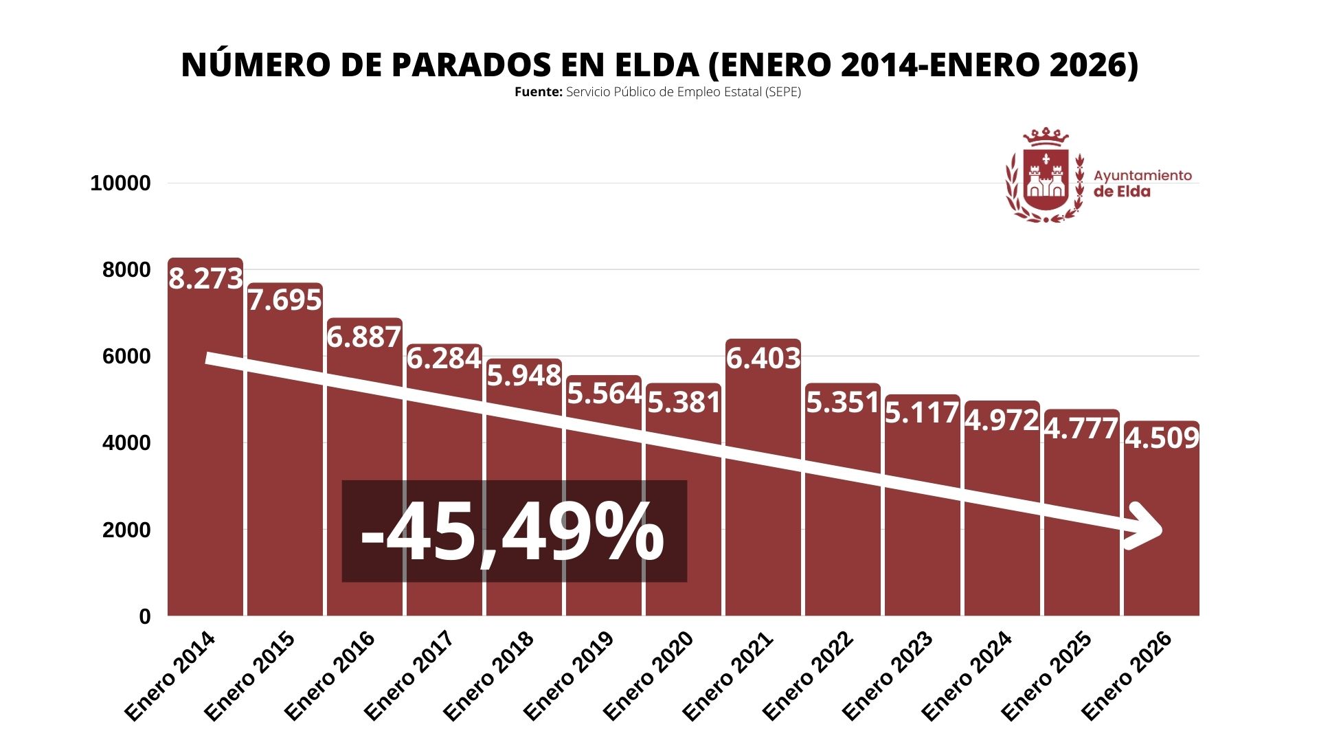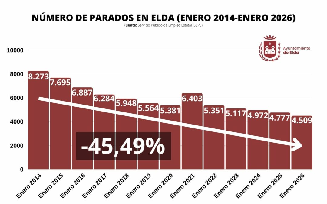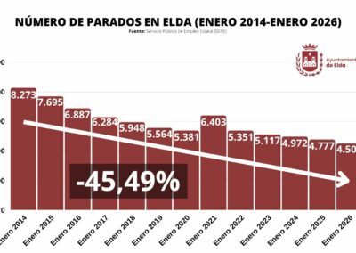 El mercado laboral eldense está mostrando su fortaleza durante los últimos once años, reduciendo el paro prácticamente a la mitad. De las 7.695 personas sin empleo registradas en enero de 2015 se ha pasado a los 4.509 en enero de 2026. Desde que Rubén Alfaro asumió la Alcaldía de Elda, en 2015, el desempleo se ha reducido un 45,49%.