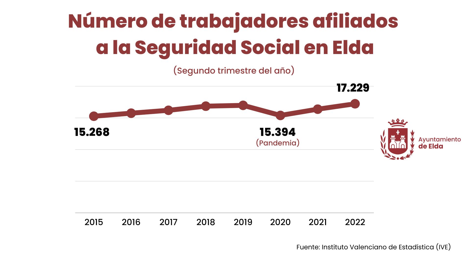 El número de trabajadores eldenses afiliados a la Seguridad Social durante el segundo trimestre de 2022 se sitúa en los niveles más altos del último decenio y la cifra de personas sin empleo en el mes de julio es la más baja desde que hay registros