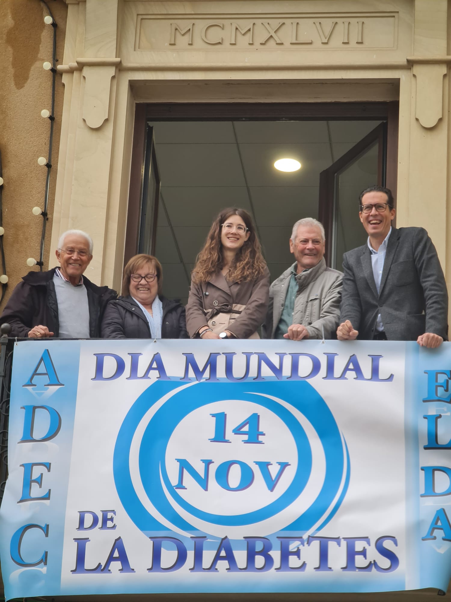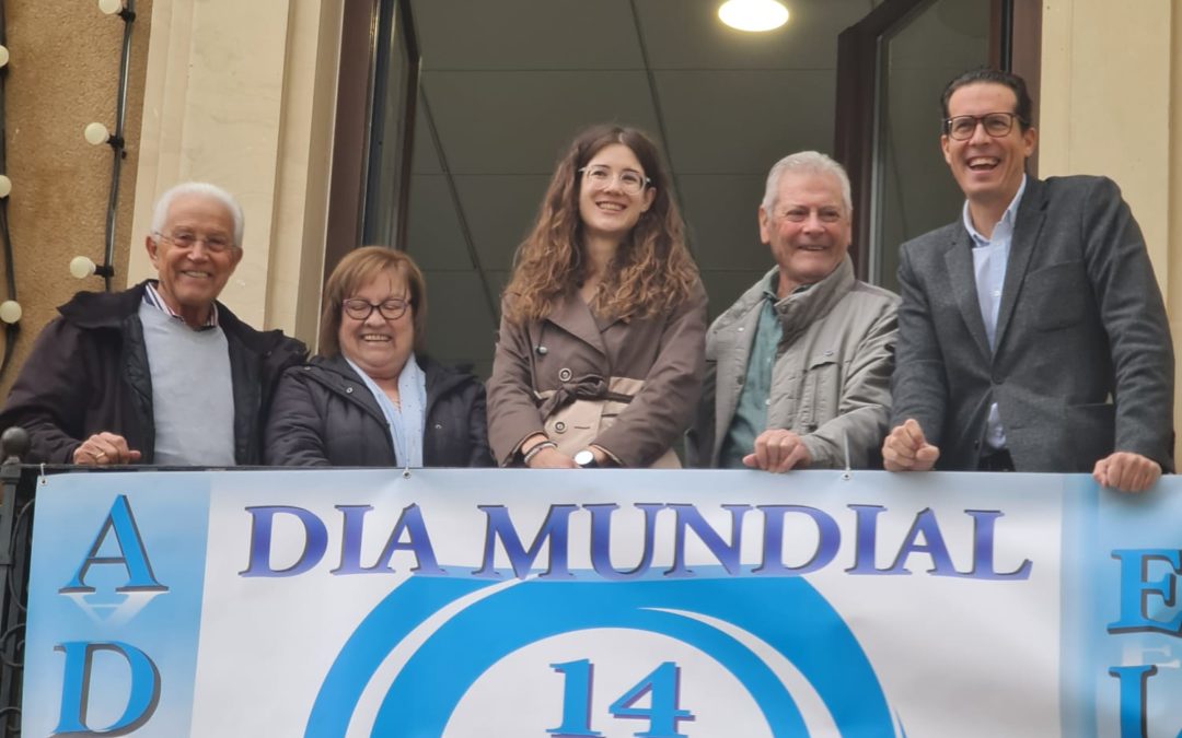 Después de la comparecencia, el alcalde de Elda, Rubén Alfaro, junto con la edil de Salud Pública y representantes de ADEC ha procedido a la colocación de una pancarta conmemorativa en el balcón consistorial.