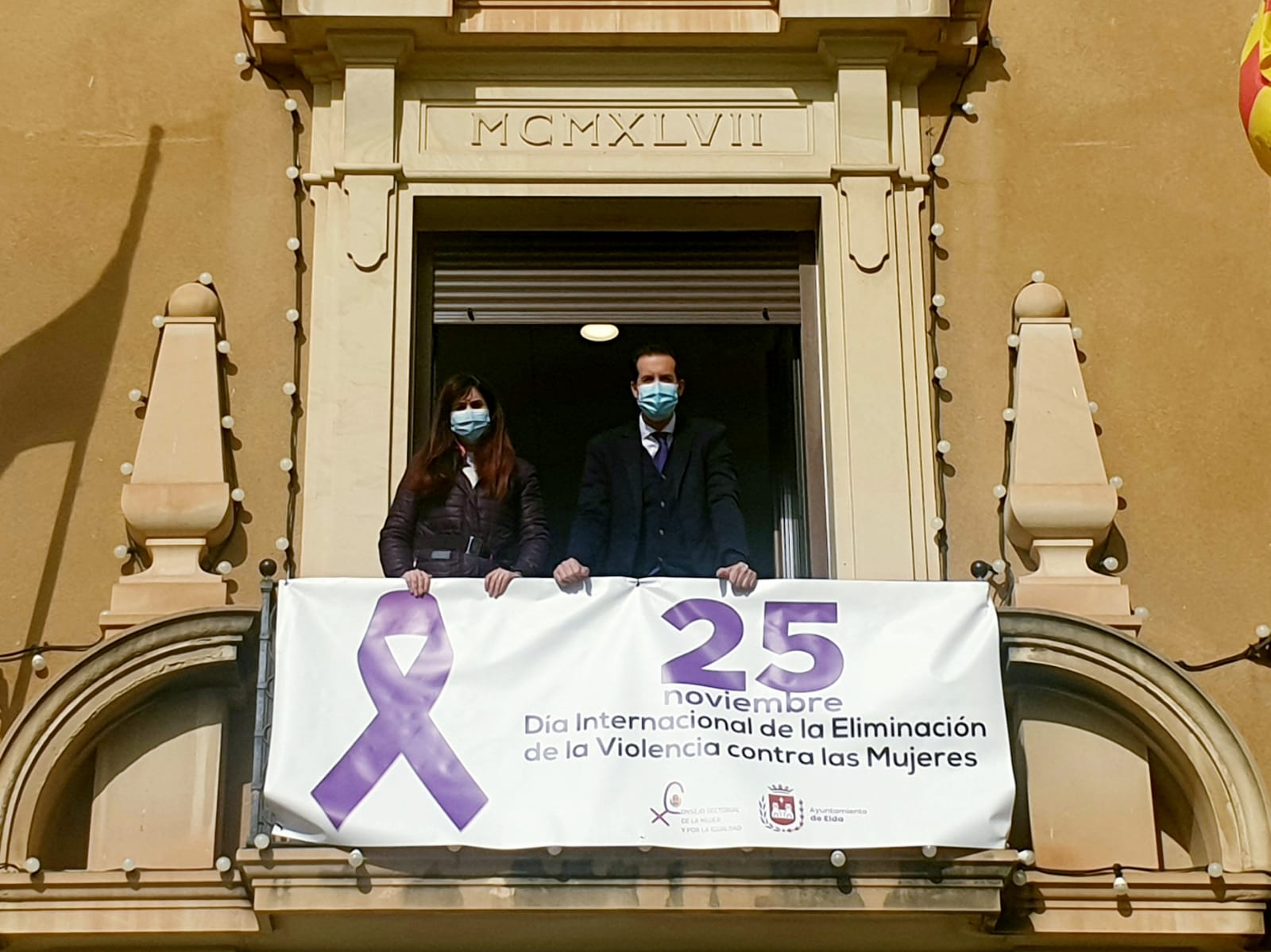 Elda se ha sumado hoy a los actos de celebración del Día Internacional de la Eliminación de la Violencia contra la Mujer con la lectura de un manifiesto a cargo de miembros de la Corporación Municipal y la colocación, por parte del alcalde de Elda, Rubén Alfaro, y la concejala de Igualdad y Mujer, Alba García, de una pancarta conmemorativa en el balcón consistorial.