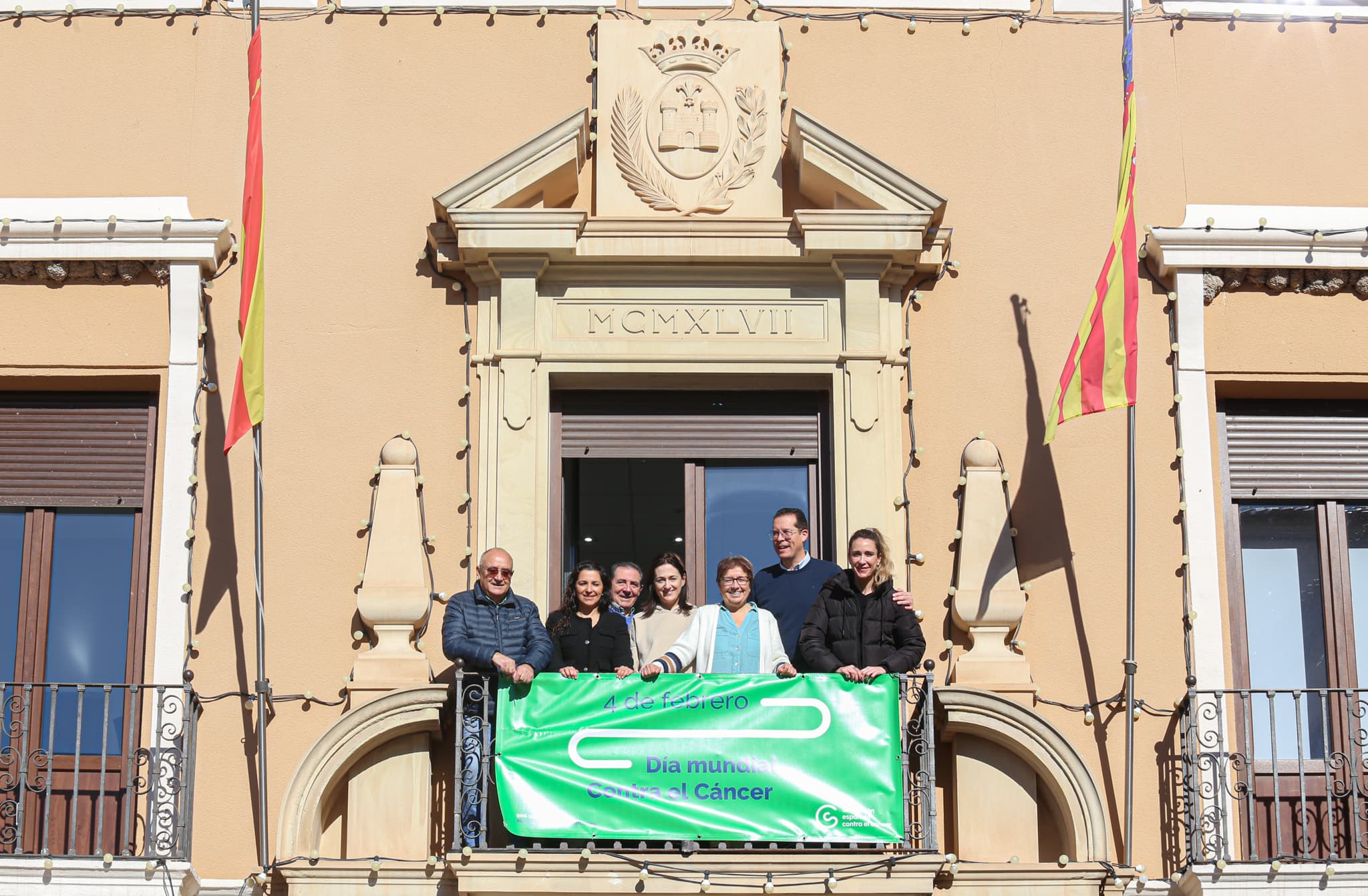 Elda se ha sumado a la celebración del Día Mundial contra el Cáncer, que se conmemora mañana 4 de febrero, con la colocación de una pancarta en el balcón del Ayuntamiento. En este acto han participado miembros de la Corporación Municipal, con el alcalde Rubén Alfaro a la cabeza, la presidenta de la Asociación contra el Cáncer en Elda-Petrer, Ana Juan y otros representantes de la entidad.