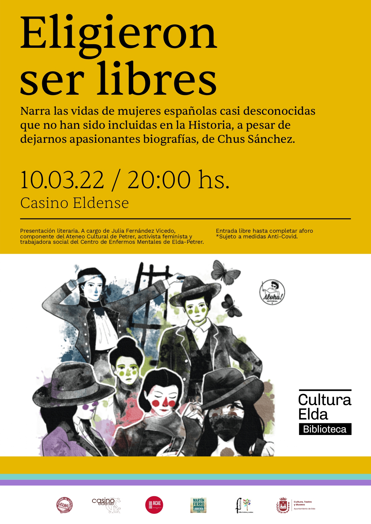 - Jueves 10 de marzo, a las 20.00 horas (Casino Eldense). Presentación de ‘Eligieron ser libres’ (Editorial Aloha), de Chus Sánchez, periodista y autora de varios libros, a la vez que ganadora de distintos premios literarios, entre ellos el de ¡Historias de amor jamás contadas”¡(Elda, 2011) La presentación correrá a cargo de Julia Fernández Vicedo, componente del Ateneo Cultural de Petrer y Trabajadora Social del Centro de Enfermos Mentales de Elda-Petrer.