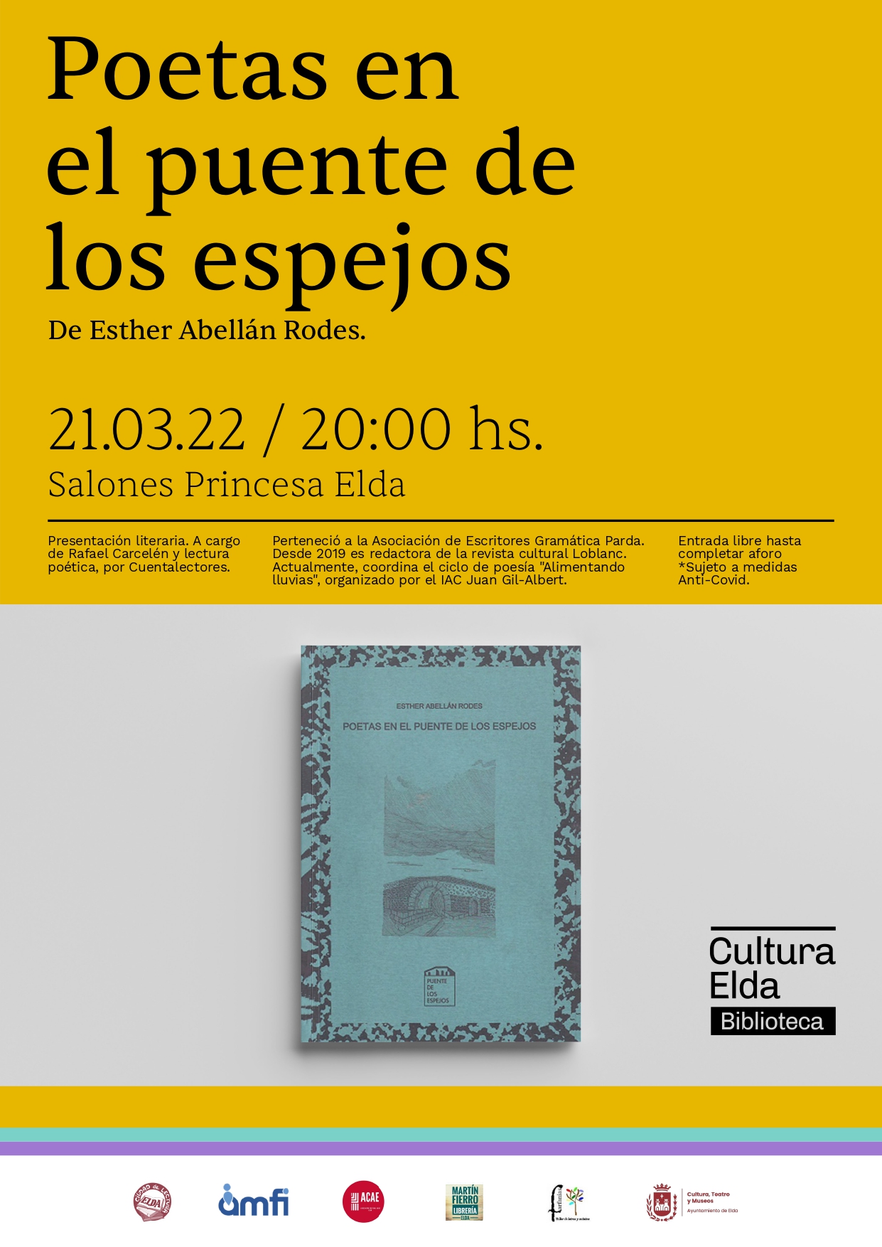 - Lunes 21 de marzo, a las 20.00 horas (Salones Princesa), con motivo del Día de la Poesía, tendrá lugar la presentación del poemario ‘Poetas en el Puente de los Espejos’ (Ed. Puente de los Espejos) de Esther Abellán. La autora, que fue fundadora de la Asociación de Escritores Gramática Parda, es desde 2019 redactora de la revista cultural Loblanc. Actualmente, coordina el ciclo de poesía ‘Alimentando lluvias’, organizado por el IAC Juan Gil-Albert. La obra es una antología analítica de poetas de la provincia de alicante comprendidos entre principios del siglo XX y la actualidad. La presentación correrá a cargo del escritor, ensayista y poeta Rafael Carcelén, contemplando una lectura poética en la que se podrá escuchar recitar sus obras a algunos de los poetas actuales reseñados en la obra.
