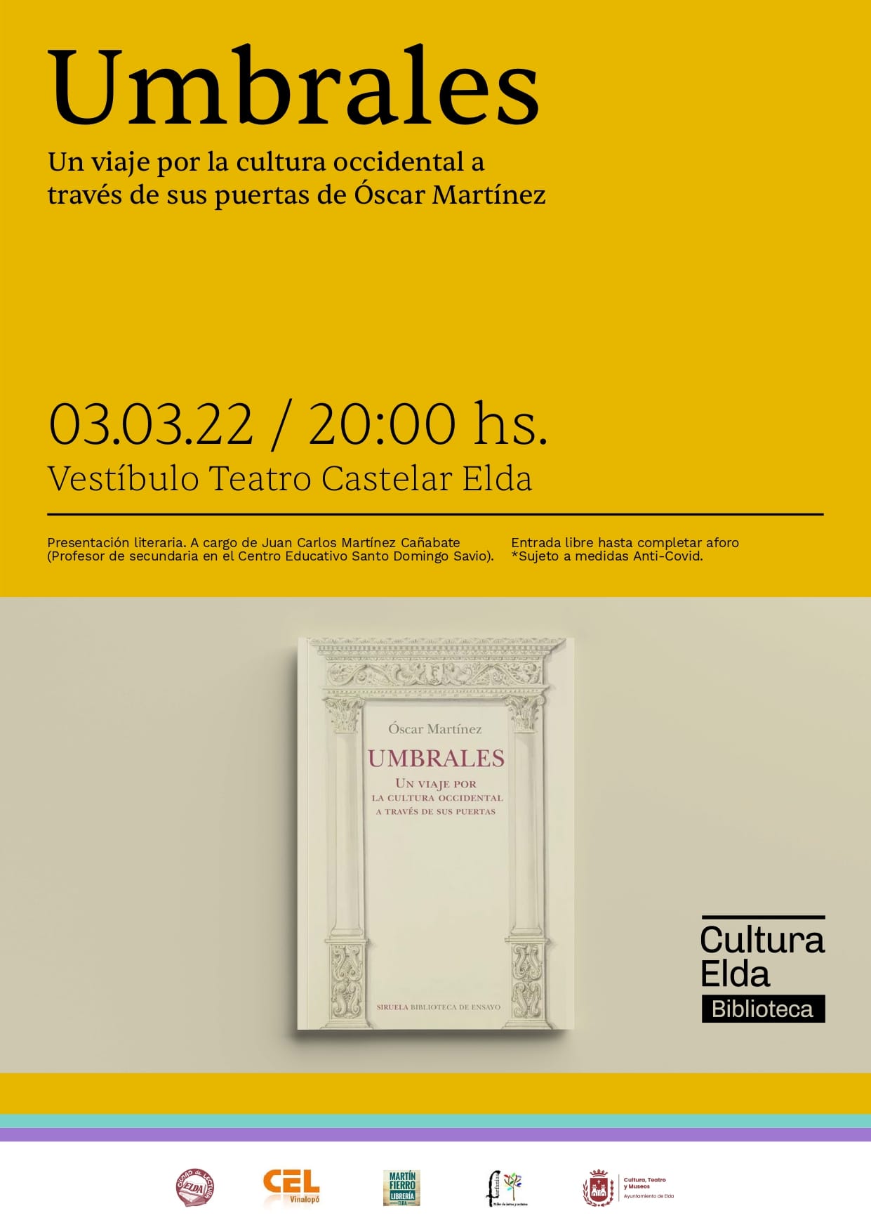 - Jueves 3 de marzo, a las 20.00 horas (vestíbulo del Teatro Castelar). Presentación de ‘Umbrales’, de Óscar Martínez, Doctor en Bellas Artes y catedrático de la Universidad de Valencia, publicado por la Editorial Siruela. La presentación correrá a cargo de Juan Carlos Martínez Cañabate, quien charlará con el autor sobre este magnífico ensayo que nos llevará a recorrer distintos monumentos históricos repartidos por gran parte de Europa, Asia y el norte de África. El libro, desde su publicación hace apenas unos meses, ha sido traducido a varios idiomas.